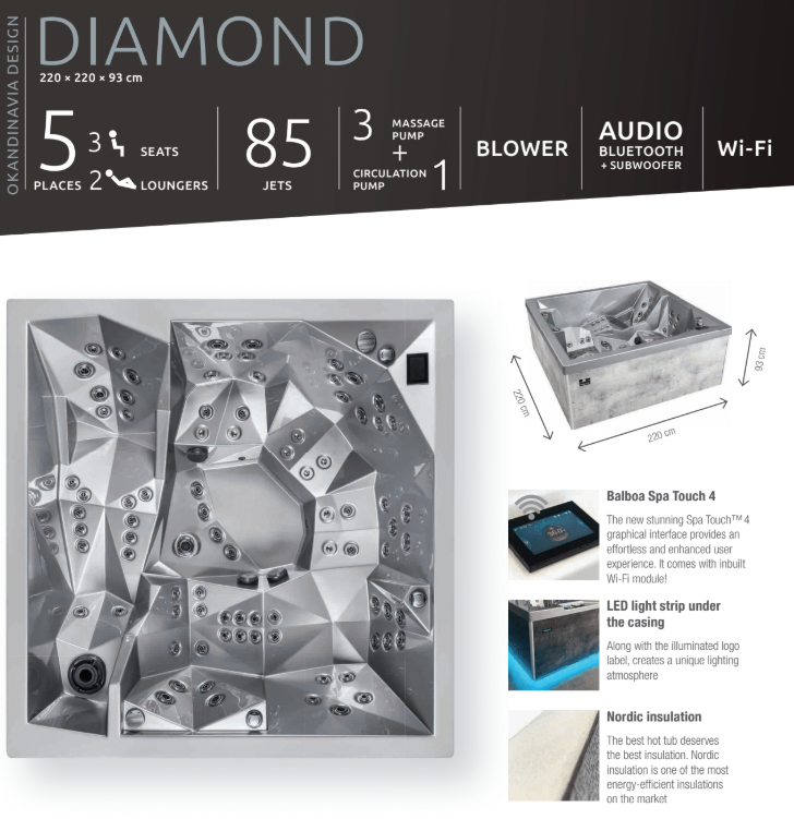Genießen Sie das geräumige Modell DIAMOND mit bis zu 5 Personen gleichzeitig. Entspannen können Sie entweder auf einem der zwei Liegeplätze oder auf drei Sitzplätzen. Für eine wohltuende Massage sorgen 85 Düsen (77 Hydromassagedüsen und 8 Luftdüsen). Zur Standardausstattung gehören farbige LED-Beleuchtung, Wasserfall, Steuersystem, Titan-Wassererwärmung sowie eine Thermoabdeckung. Die neue, beeindruckende Spa Touch 4 graphische Benutzeroberfläche bietet eine mühelose und verbesserte Benutzererfahrung. Sie wird mit einem eingebauten Wi-Fi-Modul geliefert!