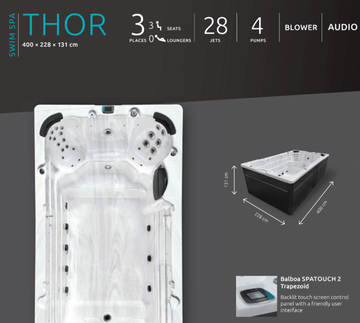 Der Swim SPA Thor verfügt über drei Sitzplätze und insgesamt 28 Düsen, darunter eine Schwimmdüse, zwei River-Typ-Düsen, acht Luftdüsen sowie 17 Massagedüsen. Er ist perfekt für 3 Personen geeignet.