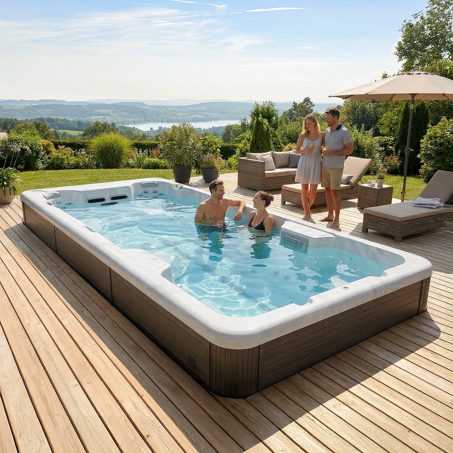Verwandeln Sie Ihren Außenbereich in eine Oase der Entspannung und Fitness mit unserem luxuriösen Swim Spa. Sein geräumiges Design mit zwei Sitzplätzen und einem beeindruckenden Wasservolumen von 8.000 Litern macht es perfekt für Erholung und sportliche Betätigung.