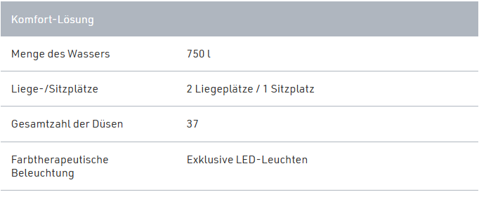 Die exklusive Farbtherapie-Beleuchtung ist eine direkte Unterwasser-Stimmungsbeleuchtung, die in die Seitenwand des Whirlpools eingebaut ist. Sie besteht je nach Whirlpool-Typ aus 10 bis 20 LEDs, die in Harmonie mit der im Whirlpool installierten zentralen Unterwasser-Farbtherapiebeleuchtung leuchten.