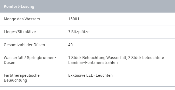 Die exklusive Farbtherapie-Beleuchtung ist eine direkte Unterwasser-Stimmungsbeleuchtung, die in die Seitenwand des Whirlpools eingebaut ist. Sie besteht je nach Whirlpool-Typ aus 10 bis 20 LEDs, die in Harmonie mit der im Whirlpool installierten zentralen Unterwasser-Farbtherapiebeleuchtung leuchten.