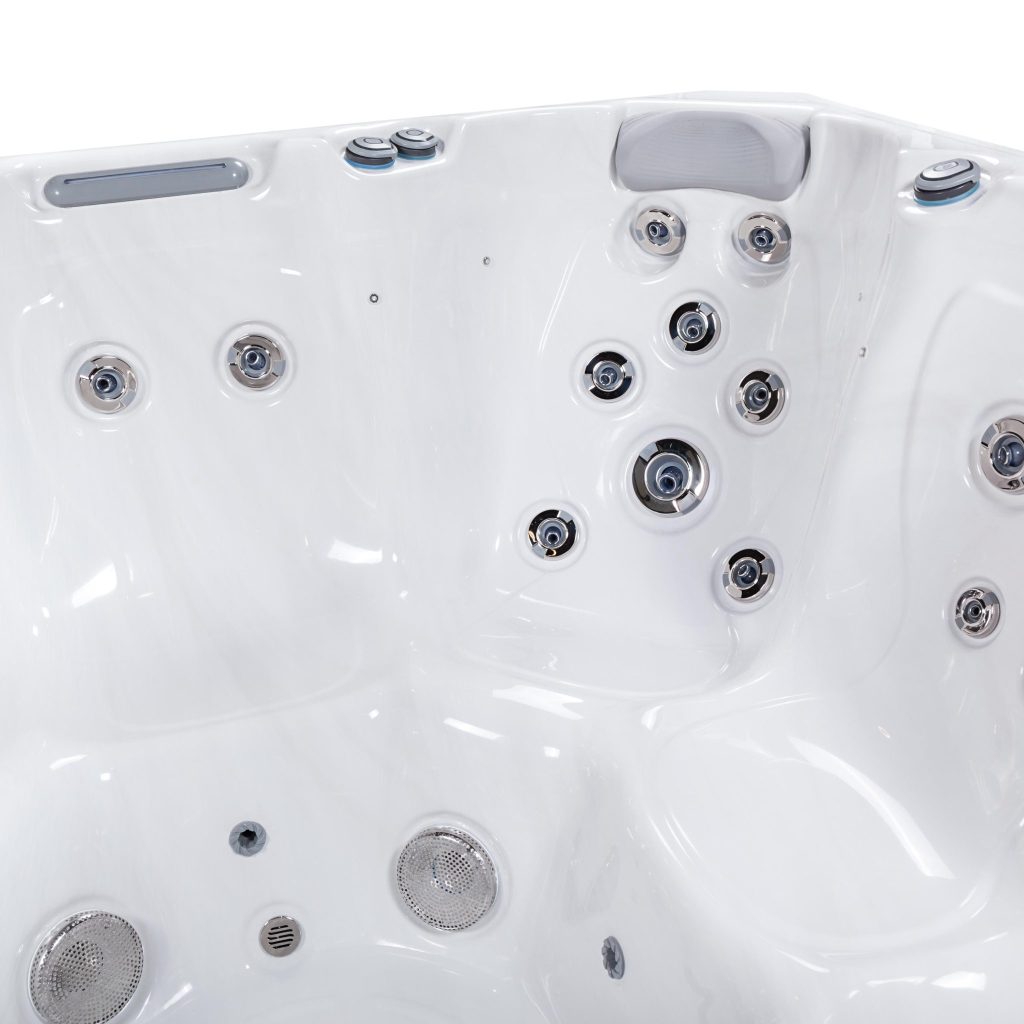 Die 40 präzise angeordneten Massagedüsen bieten eine umfassende Hydrotherapie, die Verspannungen löst und die Durchblutung fördert. Ergänzt wird dieses Erlebnis durch die integrierte 2.0-Soundanlage, die es Ihnen ermöglicht, Ihre Lieblingsmusik zu genießen. Dank der WLAN-Verbindung können Sie den Whirlpool bequem über Ihr Smartphone steuern, sei es zur Temperaturregelung, Aktivierung der Massagedüsen oder Anpassung der Beleuchtung.