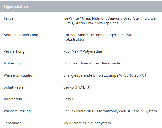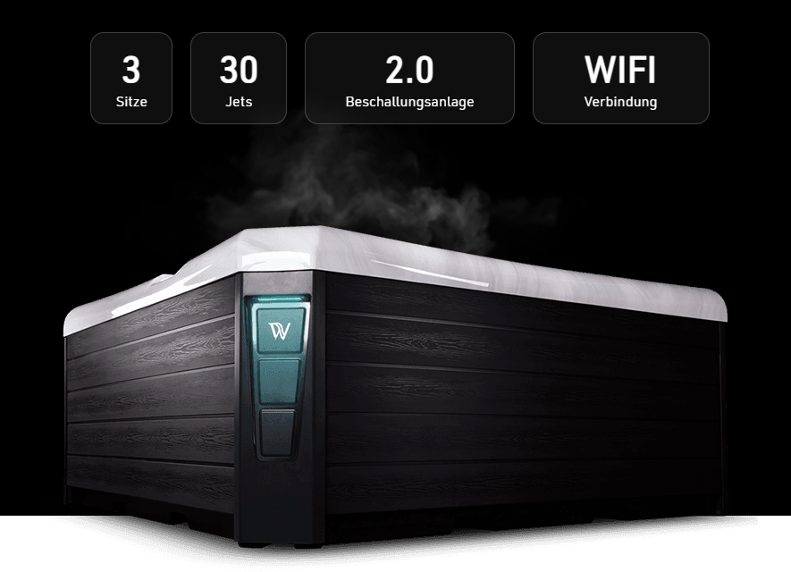 Unser kleiner Whirlpool Wellis Manhattan Life ist die perfekte Wahl für ein intimes Bad. Mit 1 Liege- und 2 Sitzpositionen ist die ergonomisch gestaltete Sitzfläche die perfekte Möglichkeit, sich nach einem anstrengenden Arbeitstag zu entspannen! Und mit einem erstaunlichen Verbrauch von 2,7 kWh/Tag ist er der perfekte Vertreter des umweltfreundlichsten Massage-Whirlpools der Welt. Mit seinem kombinierten Ozmix-Desinfektionssystem, der kristallklaren Wasserqualität und der 3,5 cm dicken skandinavischen Isolierung wird er Ihnen viele Jahre lang einen konkurrenzlosen Energieverbrauch bieten!